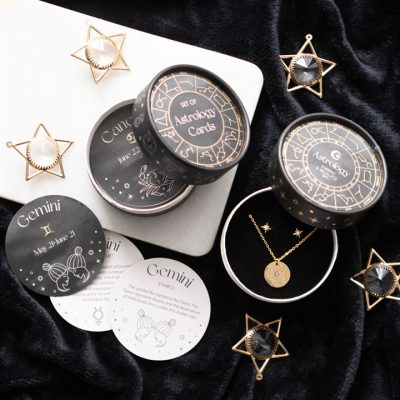 This set of 38 astrology cards will guide you through the process of reading your astrological chart and understanding its hidden meanings. Each circular card includes detailed information about each zodiac sign including its ruling planet, personality traits, compatibility and elemental symbol. Whether given as a gift or used for personal self-discovery, this card deck is a valuable tool for interpreting the deepest corners of one’s inner self.