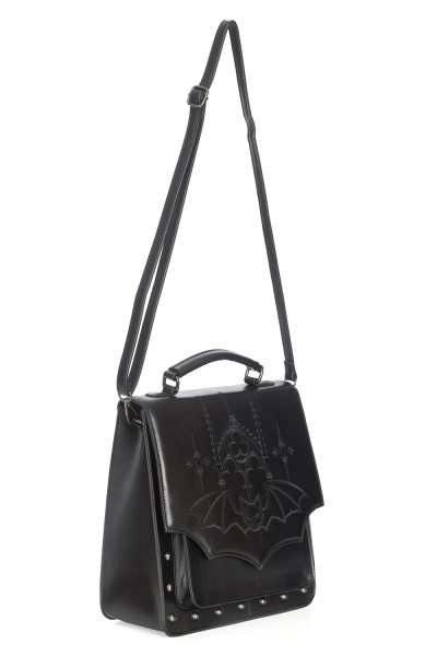 Black Gothic Bat Backpack Banned Apparel. This stylish Backpack/Handbag has an embroidered gothic bat design. The bag can be used 3 ways. You can carry the bag using the top handel. You can also use the bag as a backpack or adjust the removable straps and use it as a cross body handbag. This is a beautiful handbag, a must to complete any gothic outfit.