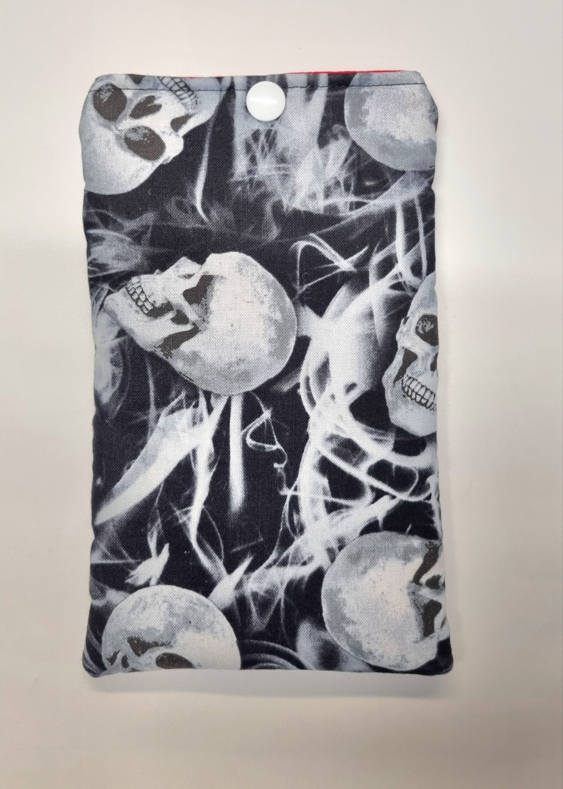 Handmade Glasses Case. A soft cotton fabric outer with smoke skull design in shades of grey & black. A cotton fabric lining and foam inner to help protect your glasses and keep the scratch free. The top of the case has a white plastic popper to stop your glasses from falling out.