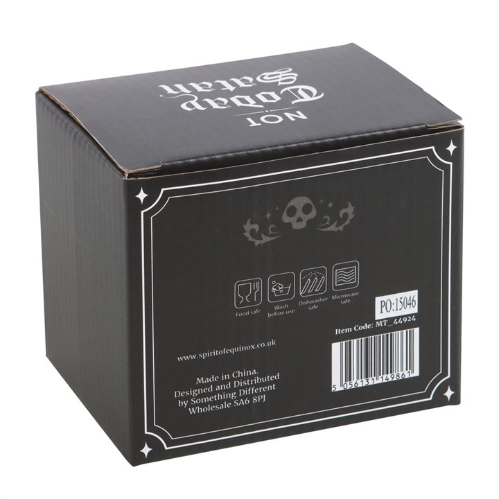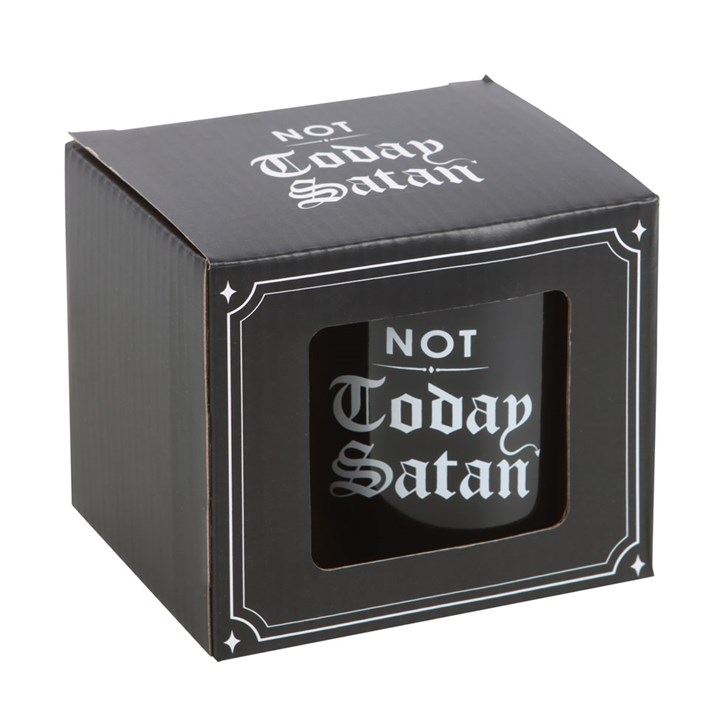 Keep your demons at bay with this funny ceramic mug. Features ‘Not Today Satan’ text written in gothic lettering for warding off unwanted hooved guests.300ml capcity. Microwave safe.